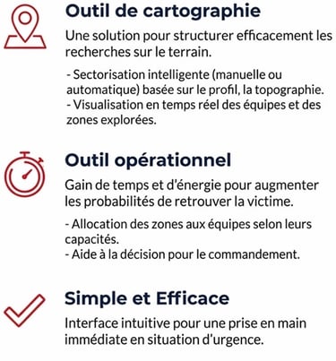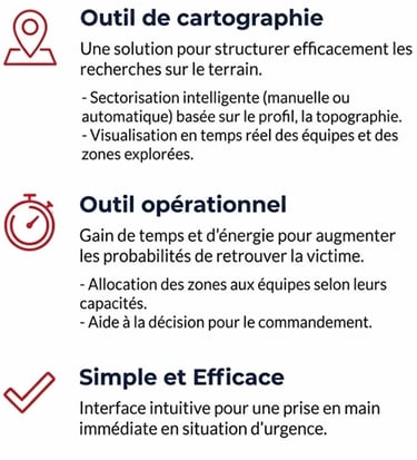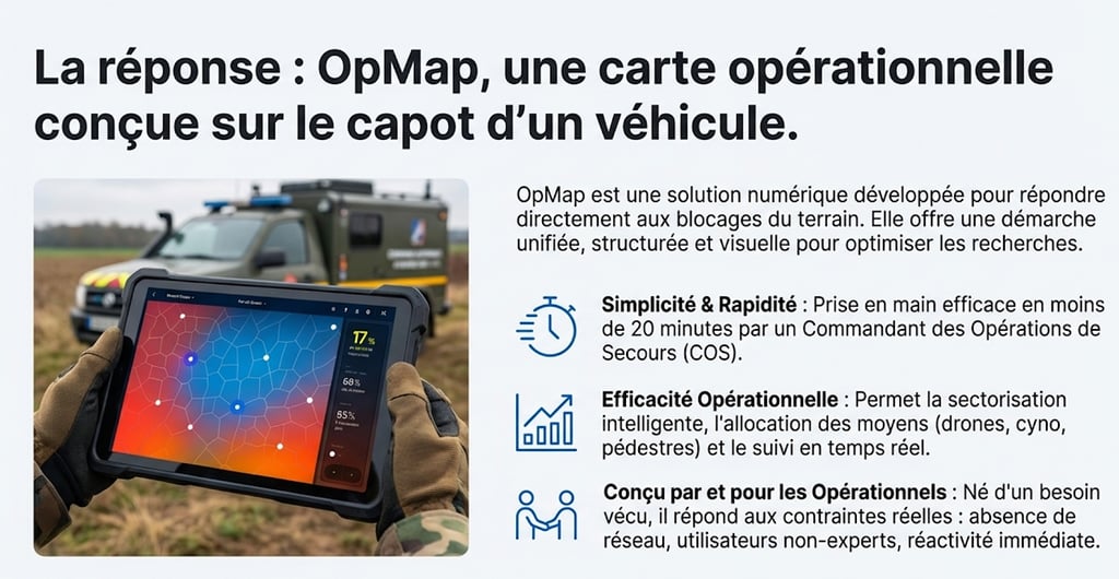 L’objectif initial d’OPmap était de fournir un outil immédiatement mobilisable, simple à prendre en main, et exploitable dès les premières minutes critiques d’une disparition. Les fonctionnalités déployées visent à répondre aux besoins urgents et concrets du terrain :