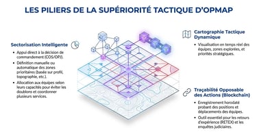 OPmap offre une cartographie dynamique qui sectorise automatiquement le territoire, affecte des missions aux équipes, suit leur progression en temps réel et enregistre chaque action dans une blockchain infalsifiable.