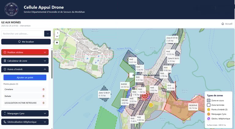 Affectation des équipes (drone, pédestre, cyno, civil…) avec visualisation sur une carte interactive ;